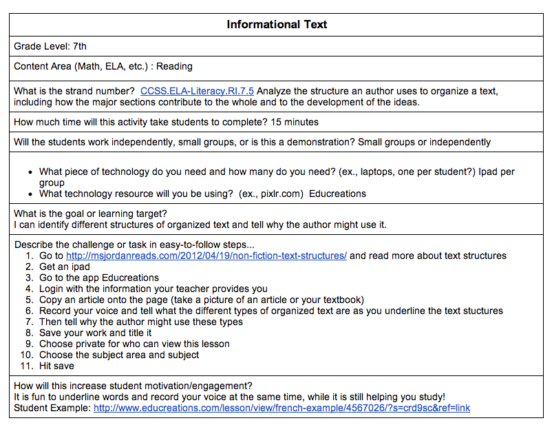 Students are then ready to get into the mix and create a student sample using the technology that they have selected.  As they work through the sample, they keep notes on the steps necessary to create the end product so that they can provide clear and specific directions in their lesson.  Here is an example of a student’s completed Informational Text Remix and their student sample: