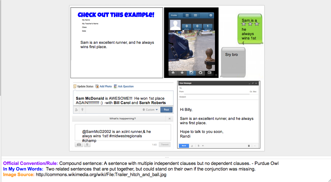 By going through this process, it challenges students to think about the differences between formal and informal communication.  It reinforces the idea of how images can represent an idea, how we should be responsible digital citizens and cite our sources, and how we communicate with different audiences.   They first take the concept/rule and input an example into the template for the research paper, they can see what is appropriate in academic writing.  By taking that same concept/rule and plugging it into the template to fake Tweet, Facebook post, Instagram post, text message, and email, they are then able to see patterns and differences that arise when writing in these different contexts.  It allows them to see what language looks like in the 21st century, across platforms.  Hopefully, inspiring them to write for the correct audience and purpose in future circumstances!